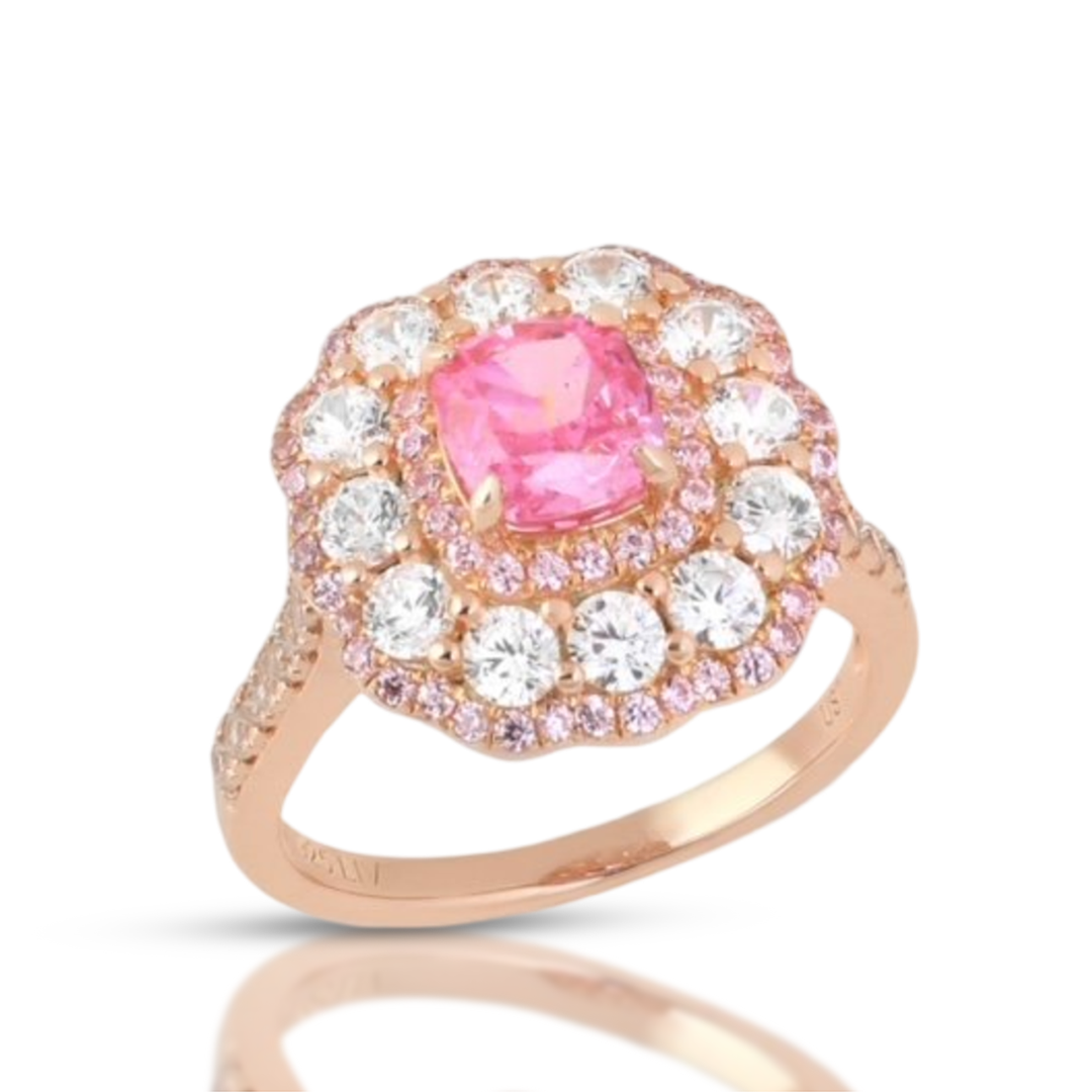 Features a of delicately own sparkling simulated diamond a beautiful Pink Ice Cut radiant and with 82 elegant petite brilliant-cut simulated diamonds. With its perfect balance of simplicity and sparkle, this ring catches the light from every angle, making it a versatile addition to any outfit. Wear it for a chic look or stack it with your other favorites for endless styling possibilities!